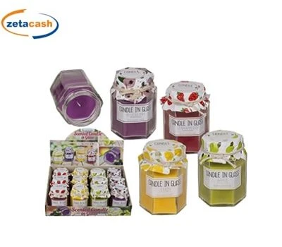 Candela profumata nel vasetto della marmellata, disponibile in essenze assortite.