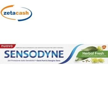 Dentifricio sensodyne herbal fresh con estratti di eucalipto e finocchio.