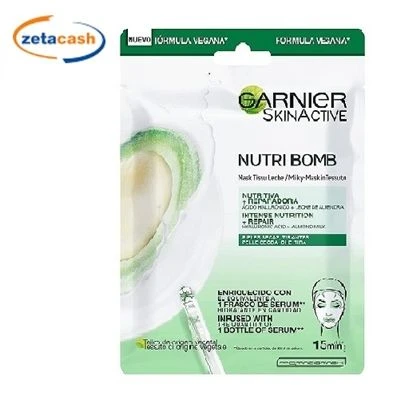 Maschera in tessuto vegetale nutriente e riparatrice con latte di mandorla e acido ialuronico. Adatta per pelle secca.