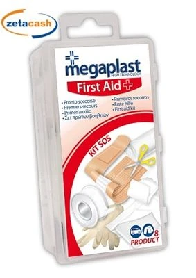 Kit pronto soccorso SOS Megaplast 8 prodotti in scatola di plastica.