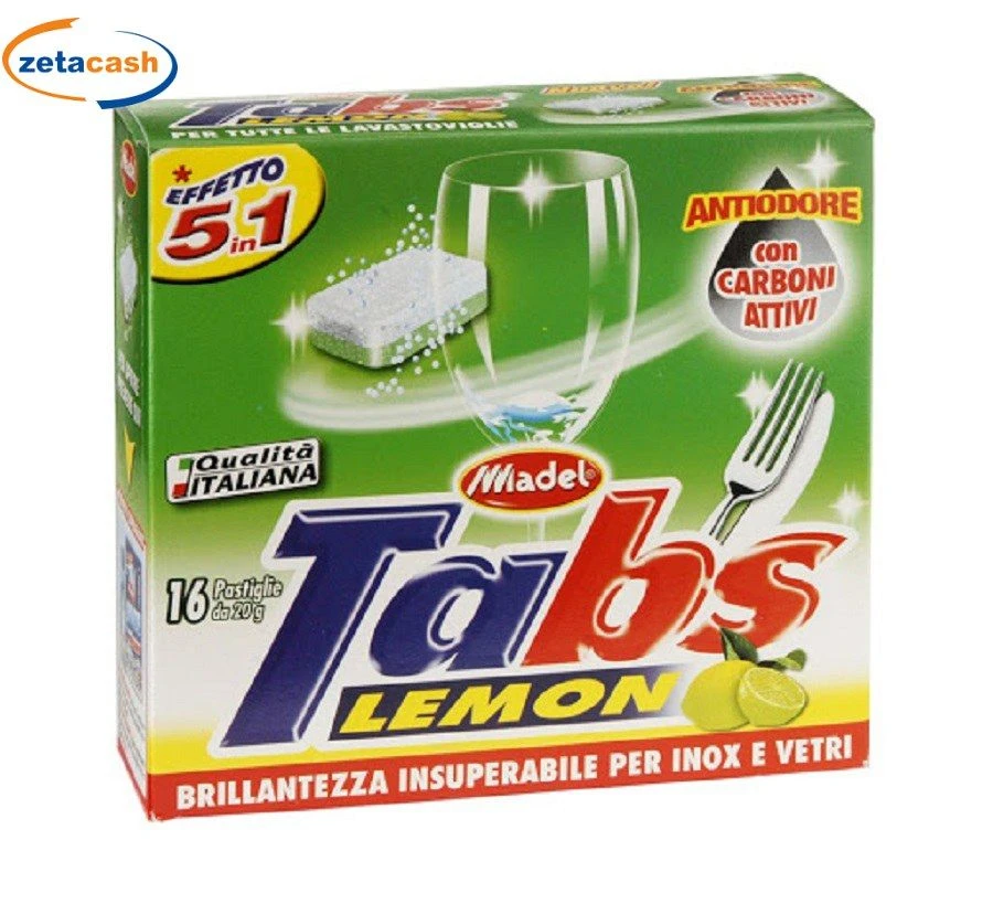 tabs per lavastoviglie profumo limone 16 pezzi effetto 5 in 1 antiodore con carboni attivi, igienizzante, brillantante, sgrassante, anticalcare.