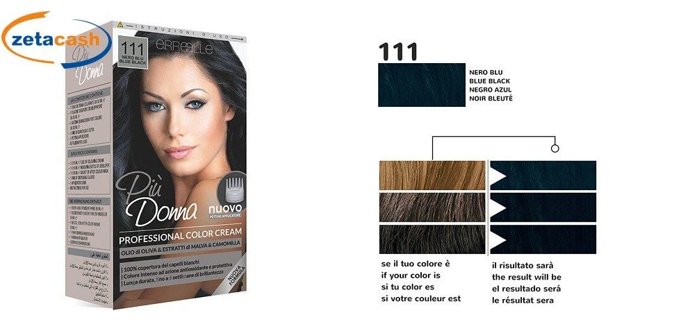 KIT PER TINTURA CAPELLI PIU’ DONNA COLORE N. 111 NERO-BLU, ALL’OLIO DI OLIVA E ESTRTTI DI MLVA E CAMOMILLA. CONTENENTE:
